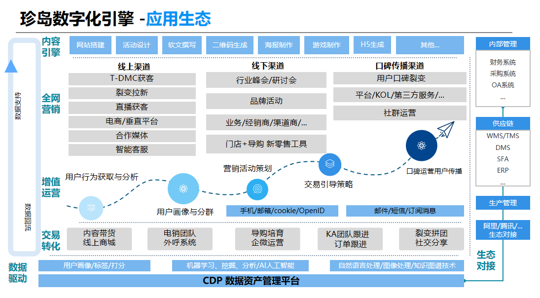 張蓬在演講中談到珍島在企業(yè)數(shù)字化運(yùn)營(yíng)增值賦能方面所做出的探索。珍島Marketingforce作為全球領(lǐng)先的SaaS智能營(yíng)銷云平臺(tái),面向企業(yè)提供了一個(gè)“智能化、數(shù)字化、工具化”的全網(wǎng)營(yíng)銷環(huán)境。營(yíng)銷獲客是企業(yè)數(shù)字化運(yùn)營(yíng)賦能過(guò)程的首要問(wèn)題,直接影響企業(yè)高質(zhì)量生存與發(fā)展,為此珍島在國(guó)內(nèi)首創(chuàng)了Marketingforce企業(yè)營(yíng)銷力賦能平臺(tái),涵蓋完整的IaaS、PaaS、SaaS三層架構(gòu),以及數(shù)字威客、云應(yīng)用市場(chǎng)、數(shù)字媒體自助等開放子平臺(tái),集成全球數(shù)字營(yíng)銷工具與資源,構(gòu)建全球、全網(wǎng)、全場(chǎng)景化的“一站式智能營(yíng)銷工作環(huán)境”,融合“跨平臺(tái)數(shù)據(jù)整合、知識(shí)圖譜、智能內(nèi)容生成、智慧發(fā)布、營(yíng)銷數(shù)據(jù)透視”等核心AI技術(shù)。生態(tài)化柔性平臺(tái)架構(gòu)設(shè)計(jì)標(biāo)準(zhǔn),讓“All In One”有機(jī)整合完美落地,為企業(yè)在私域流量獲取及管理方面進(jìn)行全面賦能,讓獲客成本趨近于零。