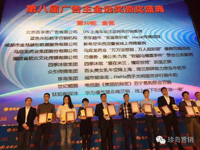 “中國廣告主金遠獎”取意“廣告點石成金,品牌高聲致遠”,是由廣告主網、《廣告主》雜志品微會主辦,中國傳媒大學MBA學院提供學術支持,是結合本土實際打造的大中華區(qū)營銷傳播領域的權威獎項;峰會與國際全面接軌,邀請業(yè)內知名人士擔當各類獎項的評審,所有獎項經過嚴格、科學、公正的評審程序。珍島集團此次包攬六項大獎,與十多年來的執(zhí)著創(chuàng)新密不可分,也標志著珍島集團在行業(yè)內領軍企業(yè)的地位。