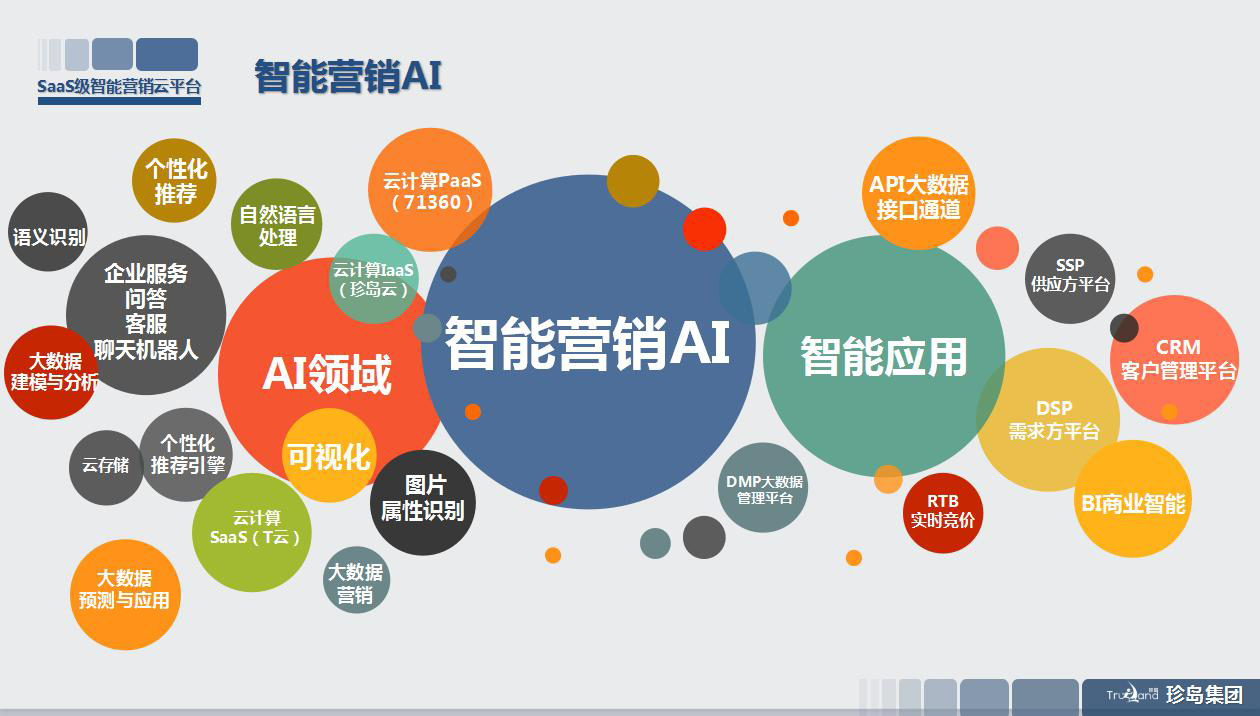 接著,韓金林博士簡(jiǎn)要介紹了珍島集團(tuán)智能營(yíng)銷AI“獨(dú)角獸”的發(fā)展歷程。經(jīng)過10多年的沉淀,珍島集團(tuán)已發(fā)展為中國(guó)領(lǐng)先的SaaS級(jí)智能營(yíng)銷云平臺(tái),形成以互聯(lián)網(wǎng)技術(shù)為依托、以云計(jì)算為支撐、以大數(shù)據(jù)為內(nèi)容變現(xiàn)、以人工智能為實(shí)現(xiàn)方式的智能營(yíng)銷生態(tài)系統(tǒng)和71360平臺(tái),融入10多個(gè)人工智能應(yīng)用領(lǐng)域,建成10多個(gè)智能營(yíng)銷子系統(tǒng)模塊,打磨出近百種智能營(yíng)銷產(chǎn)品,服務(wù)企業(yè)達(dá)6萬多家。2017年被摩根士丹利內(nèi)部評(píng)為人工智能類佳投資項(xiàng)目,2018年被《互聯(lián)網(wǎng)周刊》評(píng)選為中國(guó)人工智能企業(yè)100強(qiáng),名列第九。