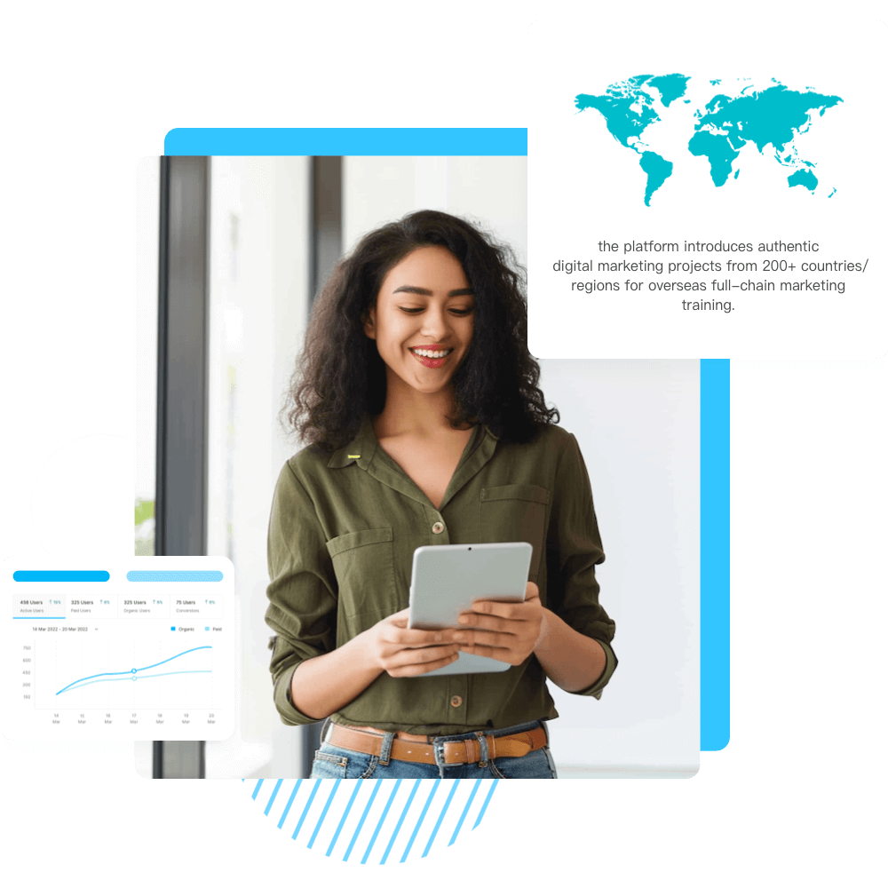 Utilizing Marketingforce's enterprise customer resources, the platform introduces authentic digital marketing projects from 200+ countries/regions for overseas full-chain marketing training. It enhances students' comprehensive job skills and meets teachers' teaching and research needs.